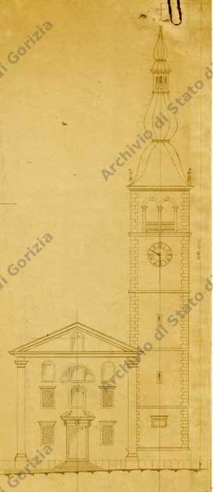 Campane e campanili: il campanile, unito alla navata collaterale destra da un portico, è alto m. 45 (46), lungo m. 5, con un’area di m. 4,50 per 4,50; rivestito di mattoni fugati, agli angoli è armato in pietra. Fu edificato assieme alla chiesa (1924). Dotato di tre campane (fa diesis, mi, re), la grande alta m. 1,50 con diametro m. 1,20, la media alta m. 1,35 con diam. 1.00, la piccola alta m. 1.25 con diametro 1.00; fuse dalla fonderia Lapagna di Trieste e benedette dal principe arcivescovo di Gorizia mons. Sedej il 28 marzo 1926, domenica delle Palme.